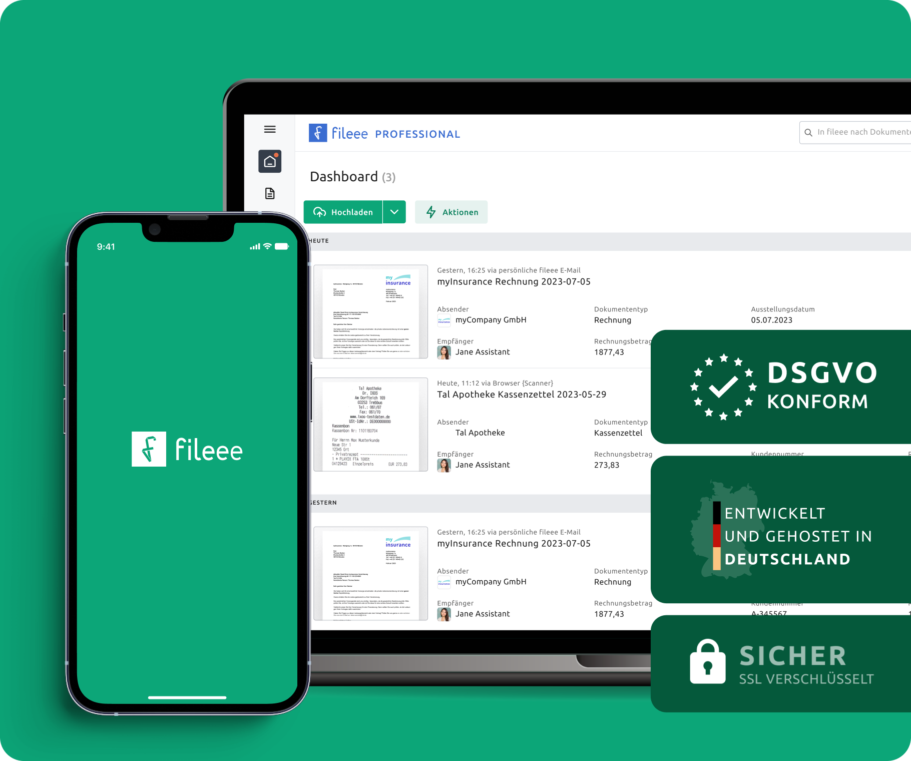 Sichere und schnelle Archivierung mit höchstem Datenschutz. Greife jederzeit bequem über App oder Web auf deine Daten zu.